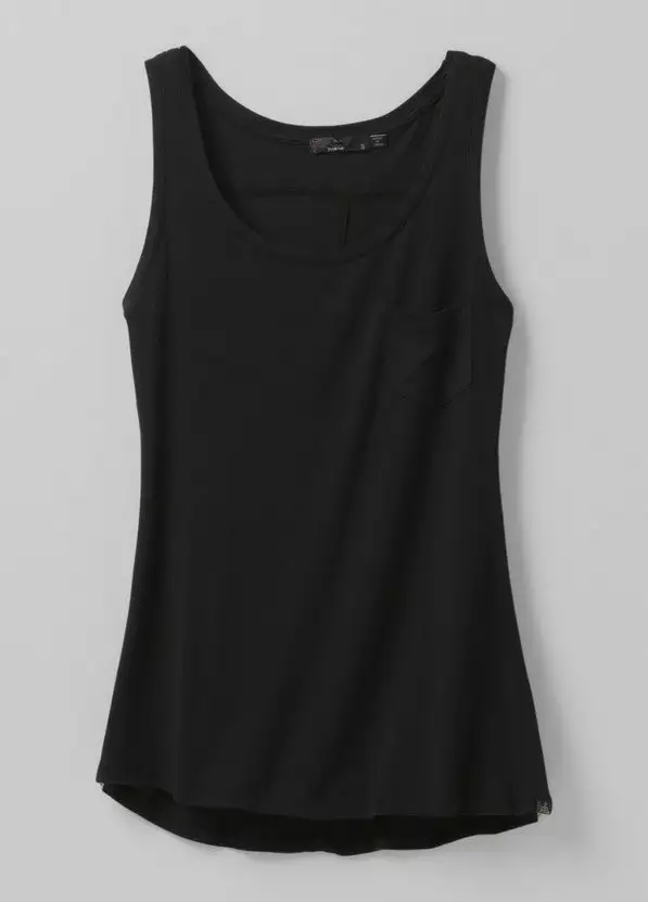 - Sleeveless scoop neck pocket tank silhouette with back seam details