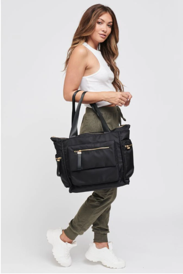 - Exterior Details: Large front snap pocket. Zipper pocket on front flap. Zip closure pocket on the back. 2 side pockets with zip closure.